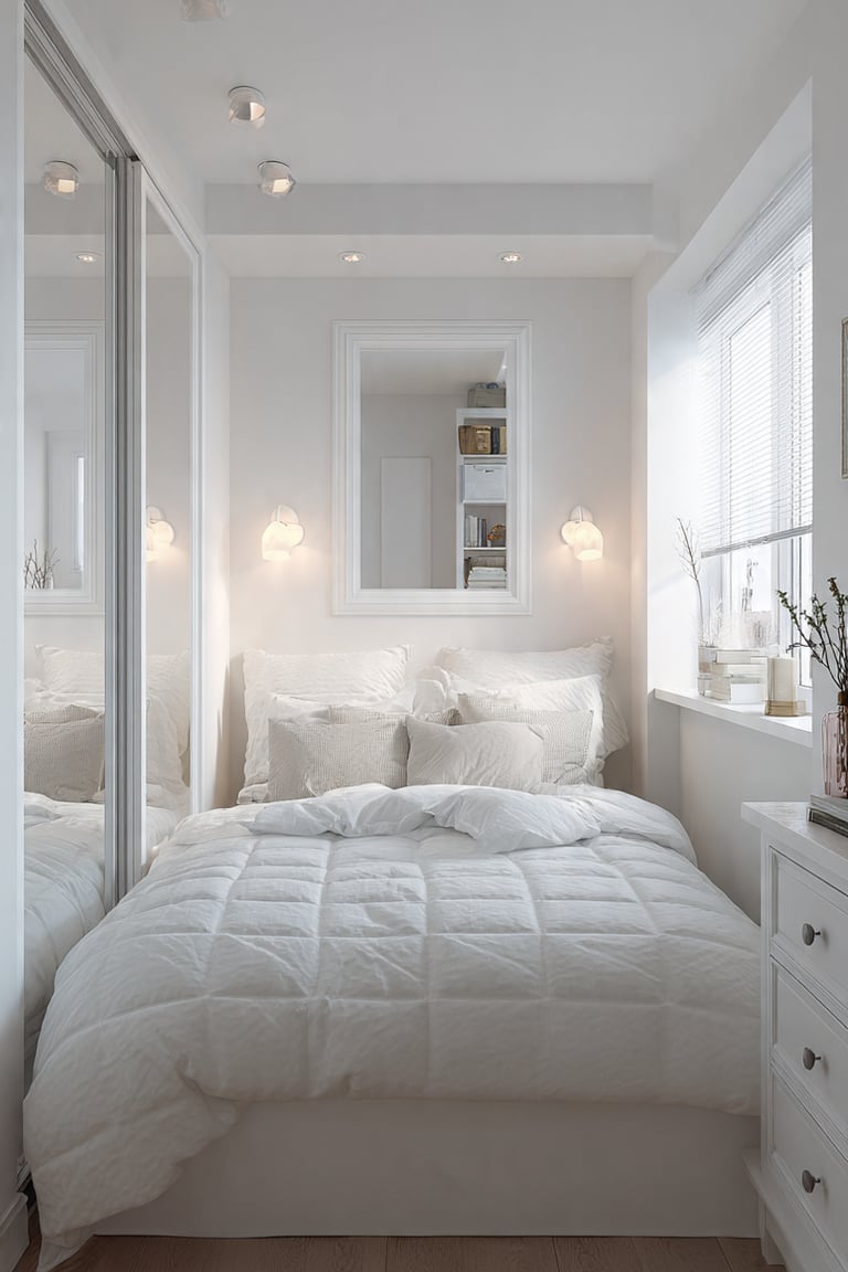 Floating nightstands + minimal furniture + large mirror.